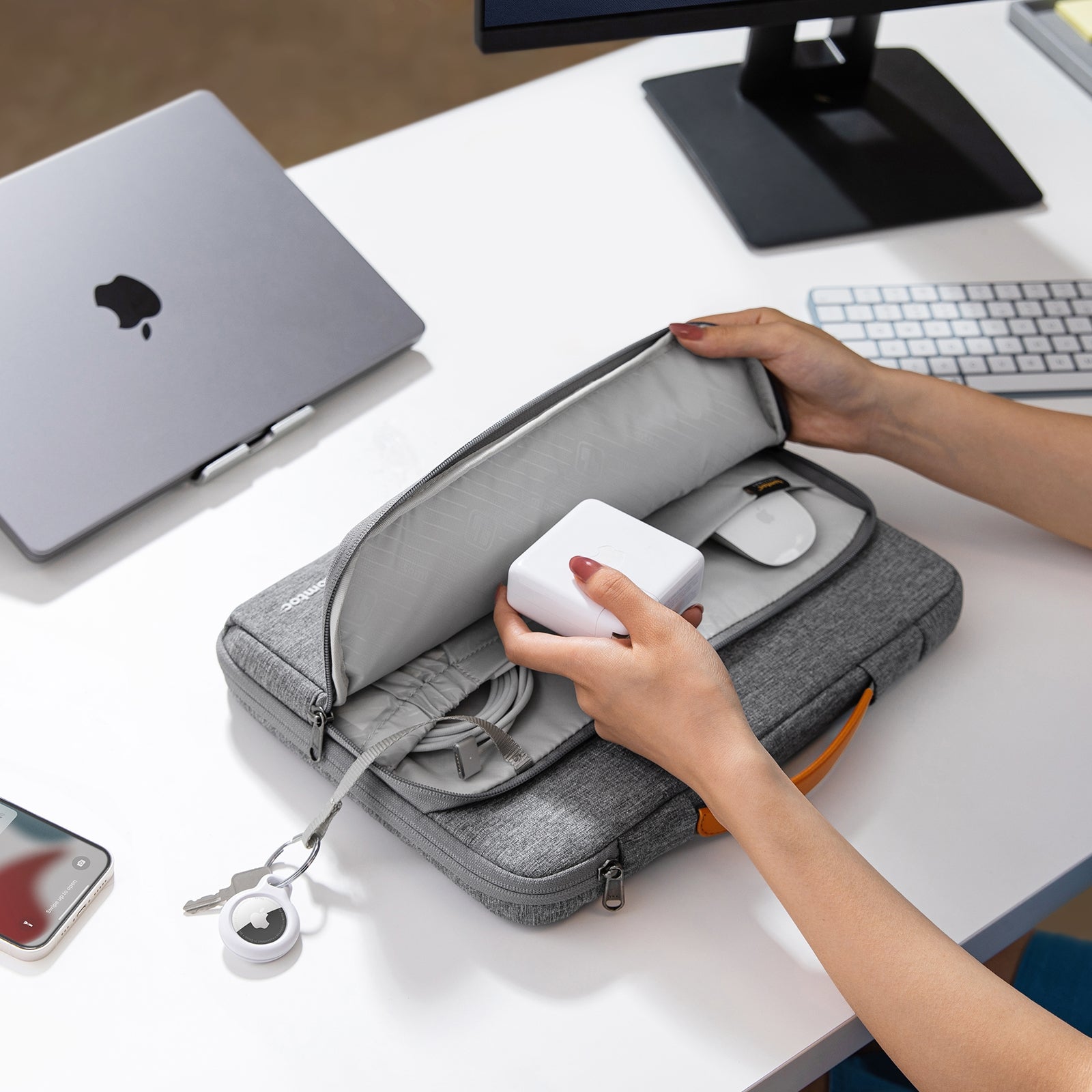 The minimalist, tri-compartment laptop bag with patented CornerArmor Technology at 4 corners, high resilience edges, sophisticated interline design with high-density soft padding, and intelligent pockets provides 360° protection for your laptop and keeps the tech kit neatly organized, making this bag a stand-out for your daily commute.