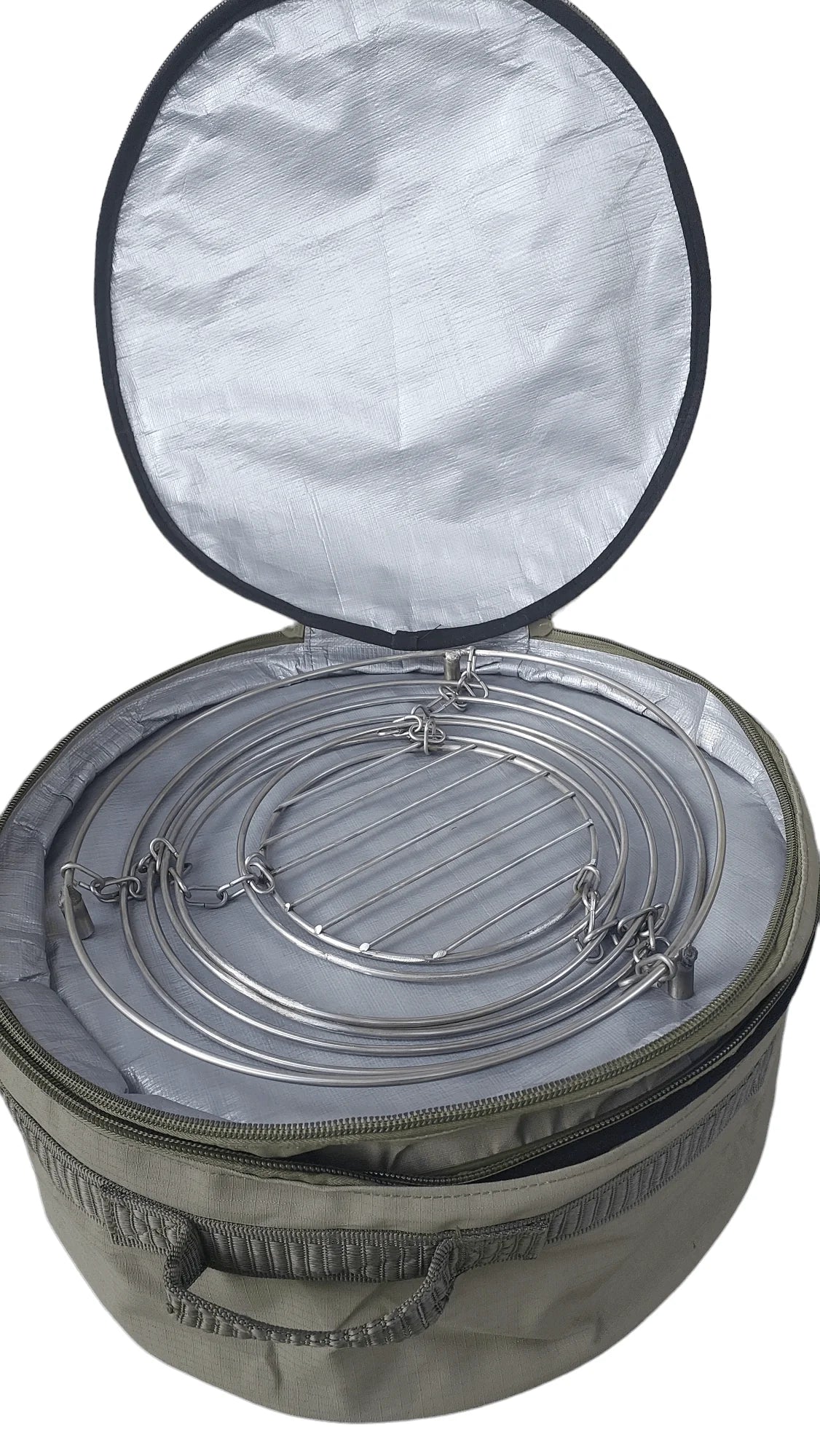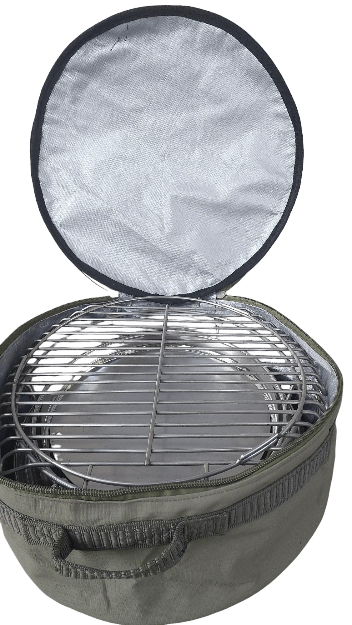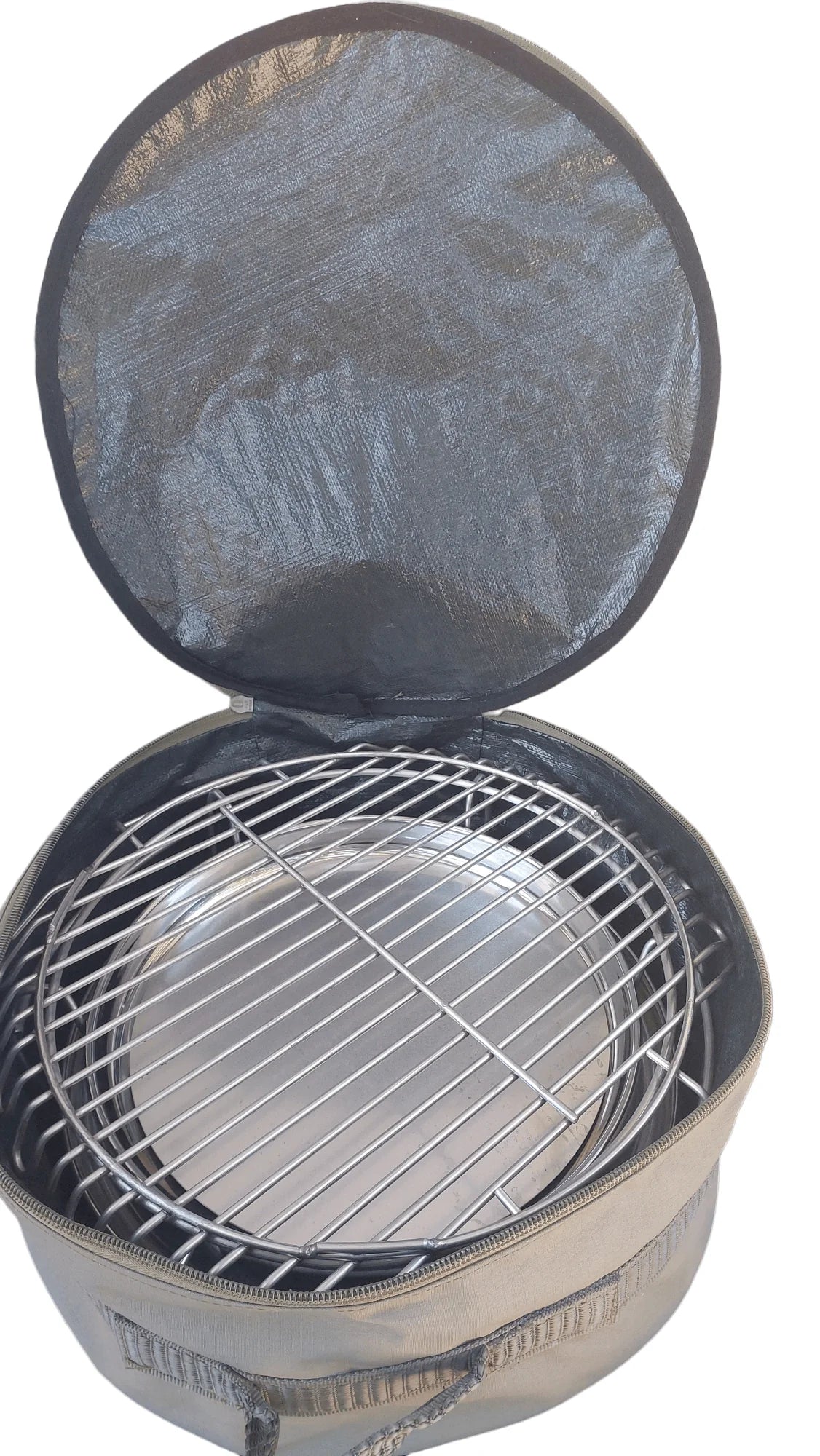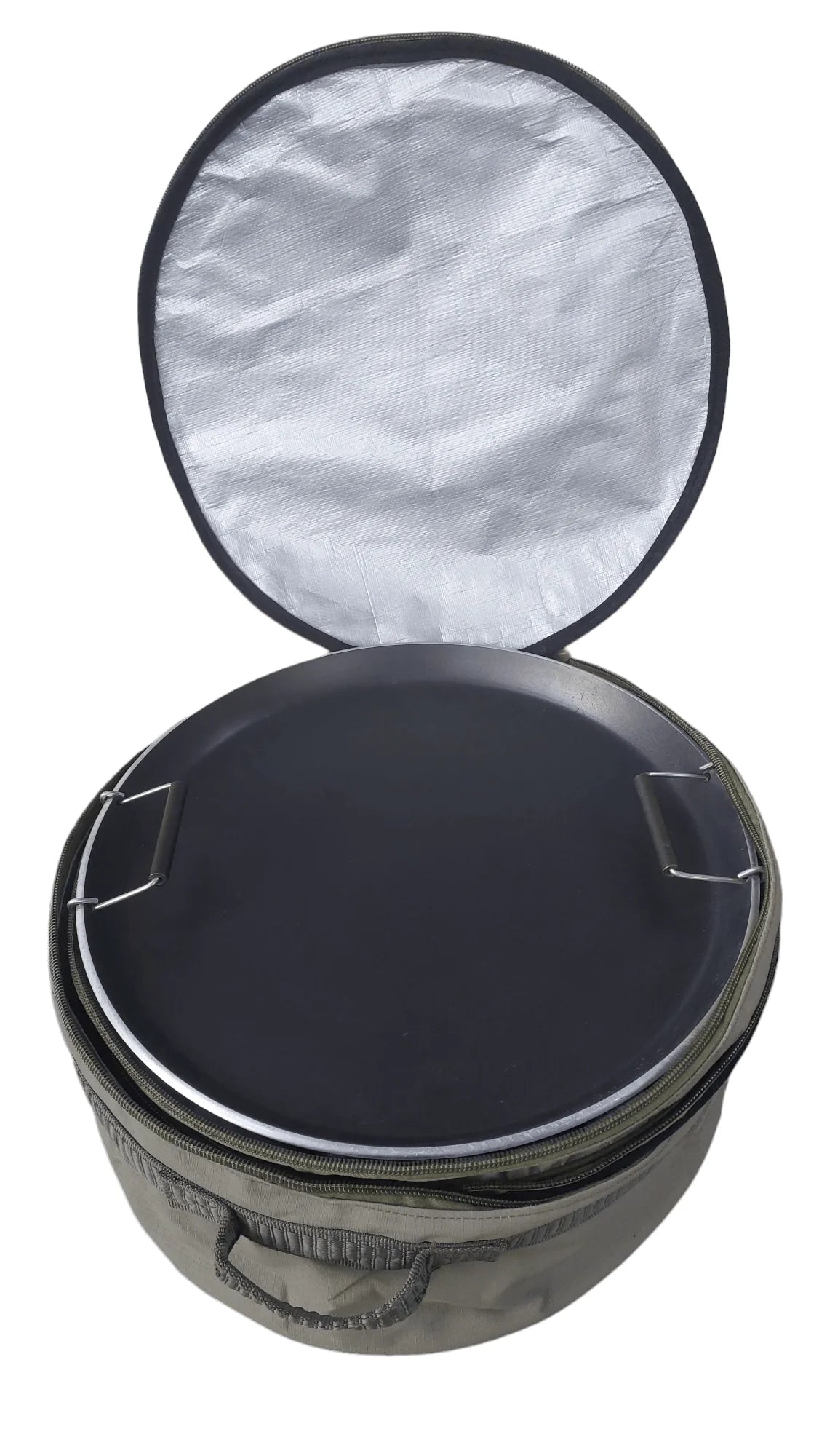The Double bag is 58cm in diameter and 22cm in depth ensuring a snug fit for the Bon Braai and accessories. The bag is high quality ripstop material with washable inner with durable zips