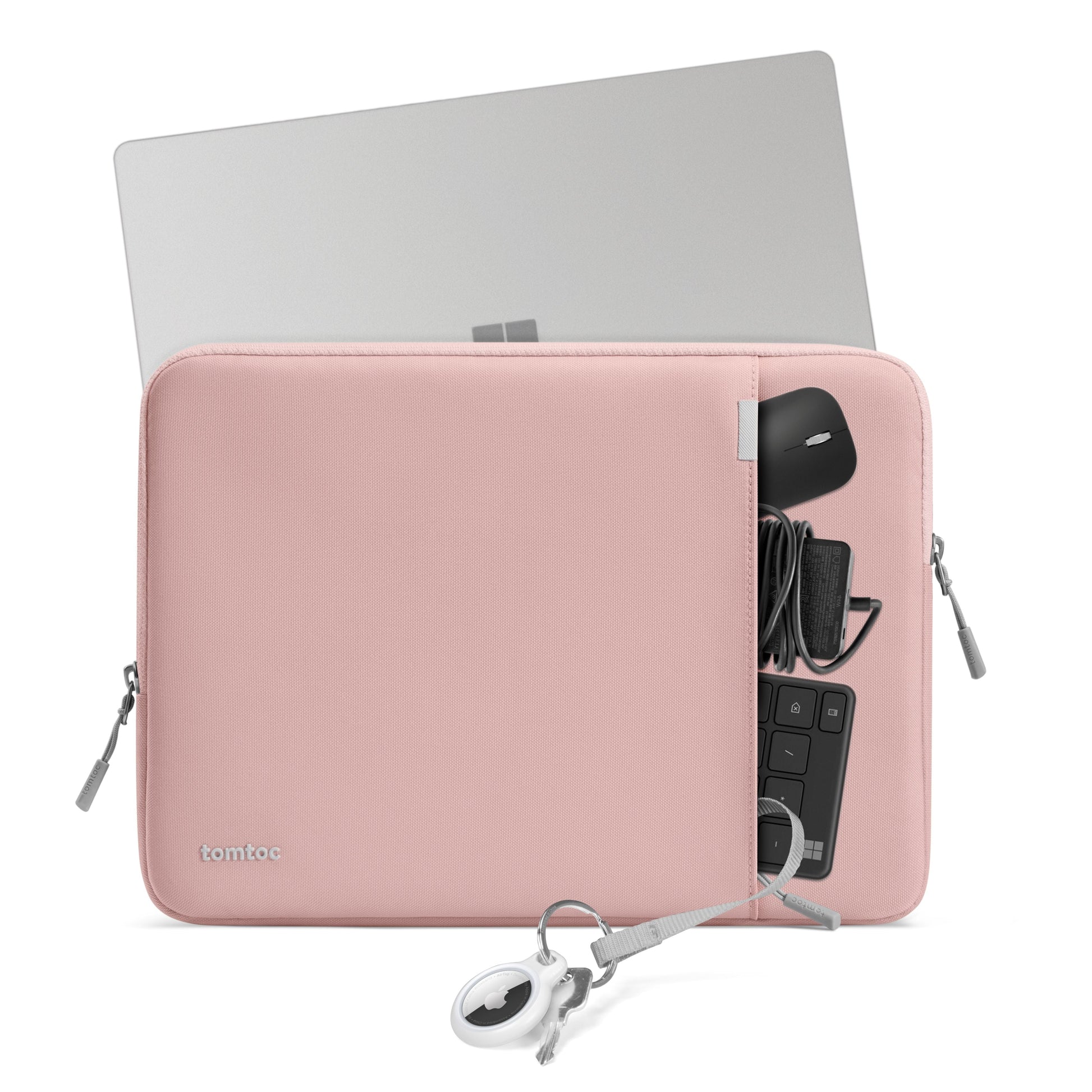 - A front pocket for storing accessories and a strap for conveniently attaching an Airtag or keys