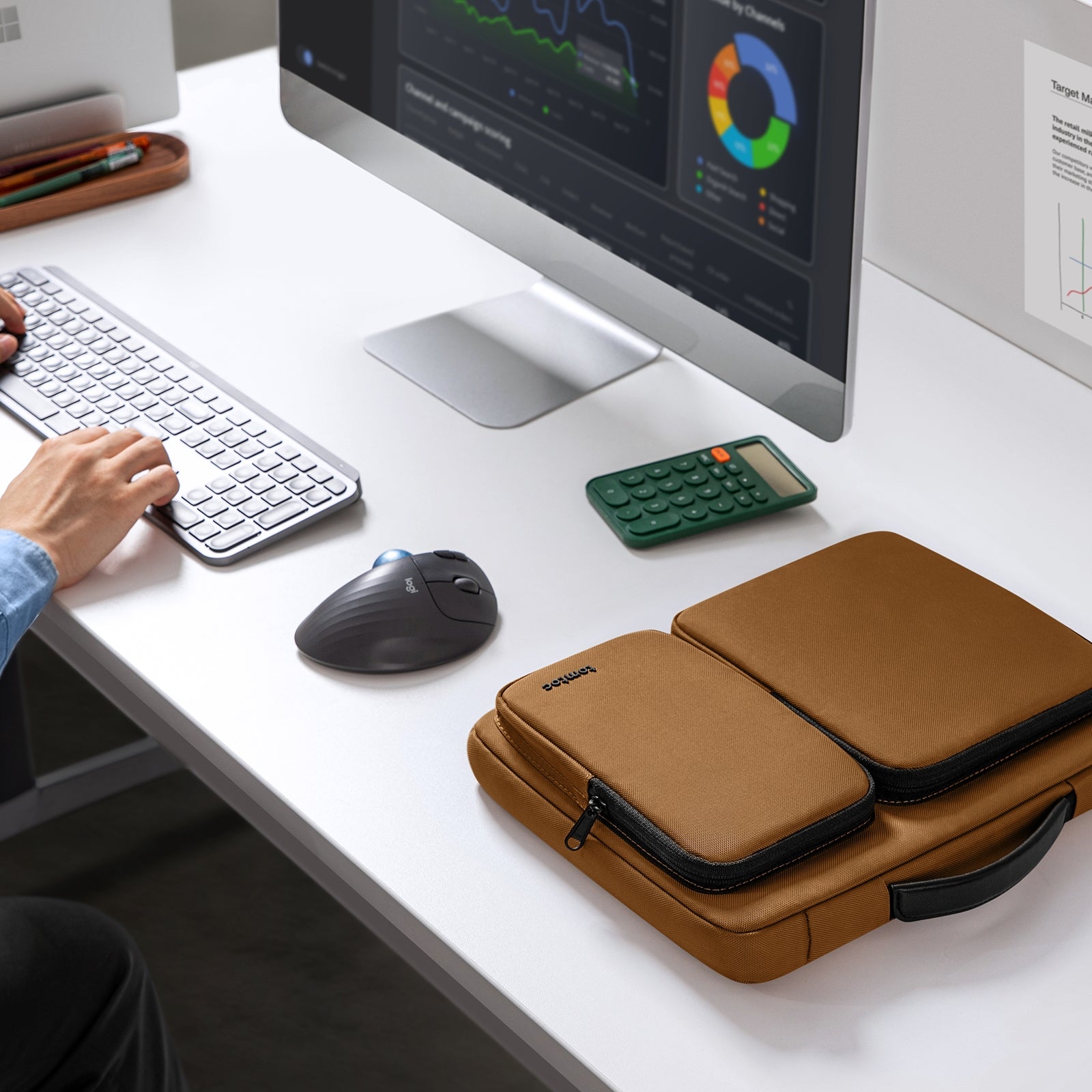 This classic business-style laptop handbag features patented tomtoc original CornerArmor technology on all four corners, highly elastic edges, sophisticated interlining, high-density padding, and spill-resistant fabric to provide 360° protection for your laptop. tomtoc's intelligent storage system with triple-divided compartments allows your technical accessories and personal belongings to stay neatly organized. The lightweight design and padded PU leather handles provide a more comfortable experience for everyday work or business travel, allowing you to travel in one bag easily.
