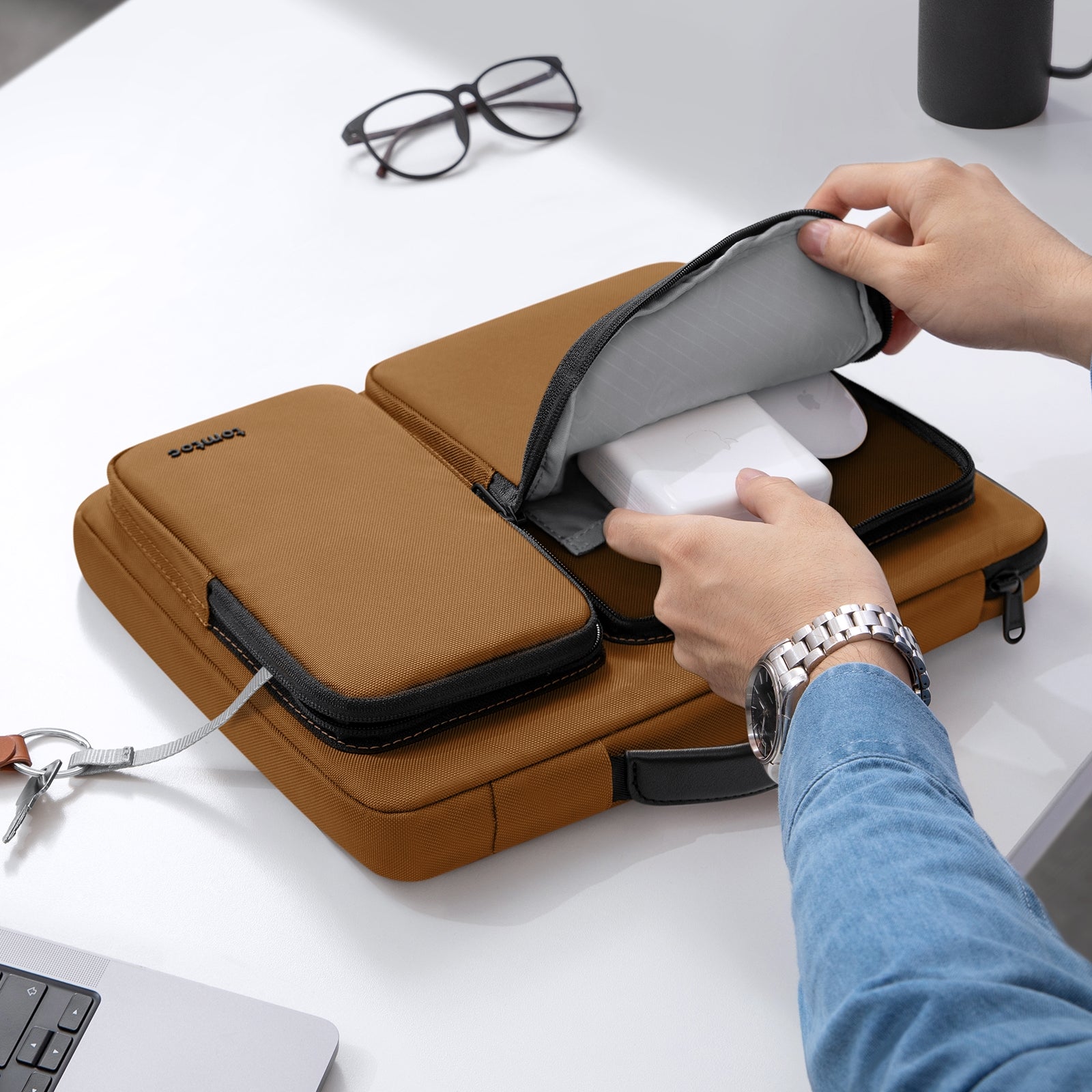 This classic business-style laptop handbag features patented tomtoc original CornerArmor technology on all four corners, highly elastic edges, sophisticated interlining, high-density padding, and spill-resistant fabric to provide 360° protection for your laptop. tomtoc's intelligent storage system with triple-divided compartments allows your technical accessories and personal belongings to stay neatly organized. The lightweight design and padded PU leather handles provide a more comfortable experience for everyday work or business travel, allowing you to travel in one bag easily.