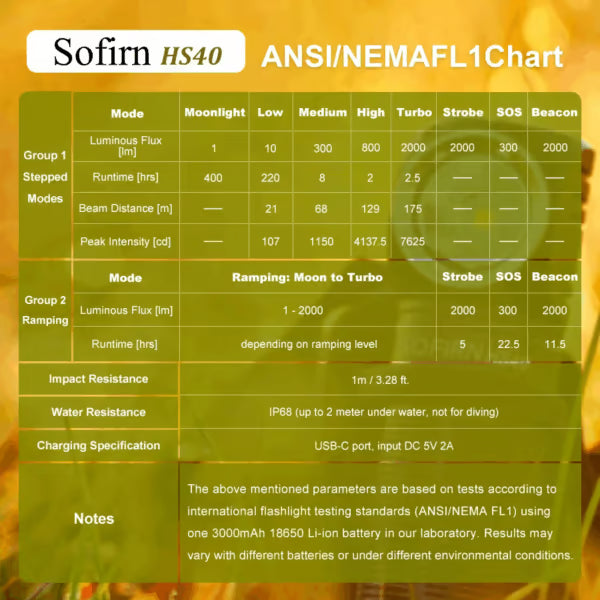 The Sofirn HS40 features an SST40 LED with a 5000K color temperature, delivering a maximum output of 2000 lumens with a beam throw of 175 meters, powered by an included 18650 Li-ion battery (3000mAh). It offers multiple modes, controlled by a side switch, with the following lumen outputs and runtimes: