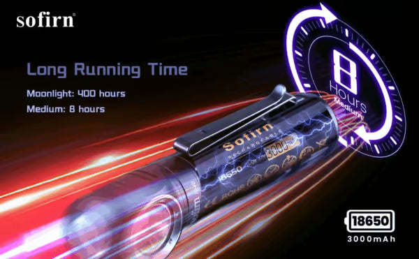 Low: 1 lumen for approximately 400 hours - Battery: 1x 3000mAh 18650 Li-ion (Included)