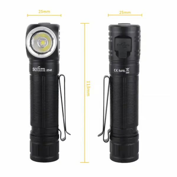 The Sofirn HS40 is constructed from aerospace-grade 6061 aluminum alloy with a Type III hard-anodized finish, offering durability for outdoor conditions like hiking or camping. It measures 111mm in length, 26mm in head diameter, and 25mm in body diameter, weighing 65g without the battery (approximately 115g with the included 18650 battery), making it comfortable for extended wear. The headlamp features a magnetic tail cap, a two-way pocket clip, and an adjustable headband, though the clip may protrude slightly when attached.