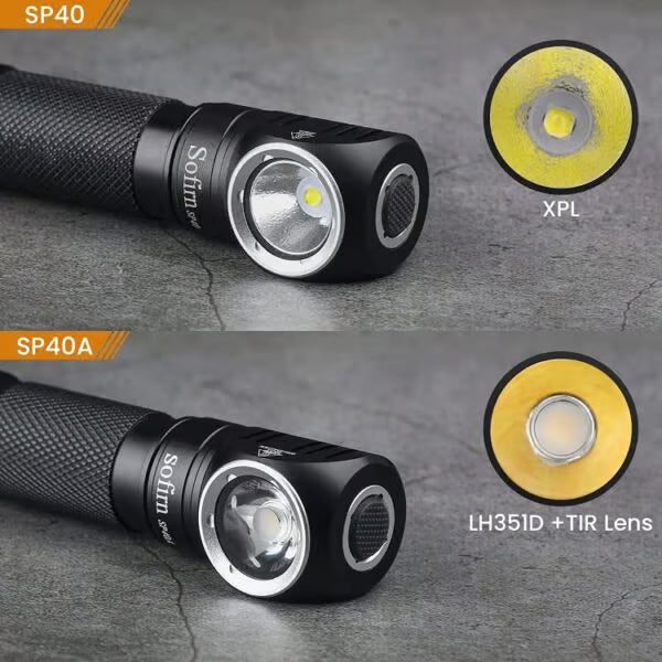 The Sofirn SP40 features a Cree XP-L LED with a 5000-5700K color temperature, delivering a maximum output of 1200 lumens with a beam throw of 136 meters, powered by an included 18650 Li-ion battery (3000mAh). It offers multiple modes, controlled by a side switch, with the following lumen outputs and runtimes: