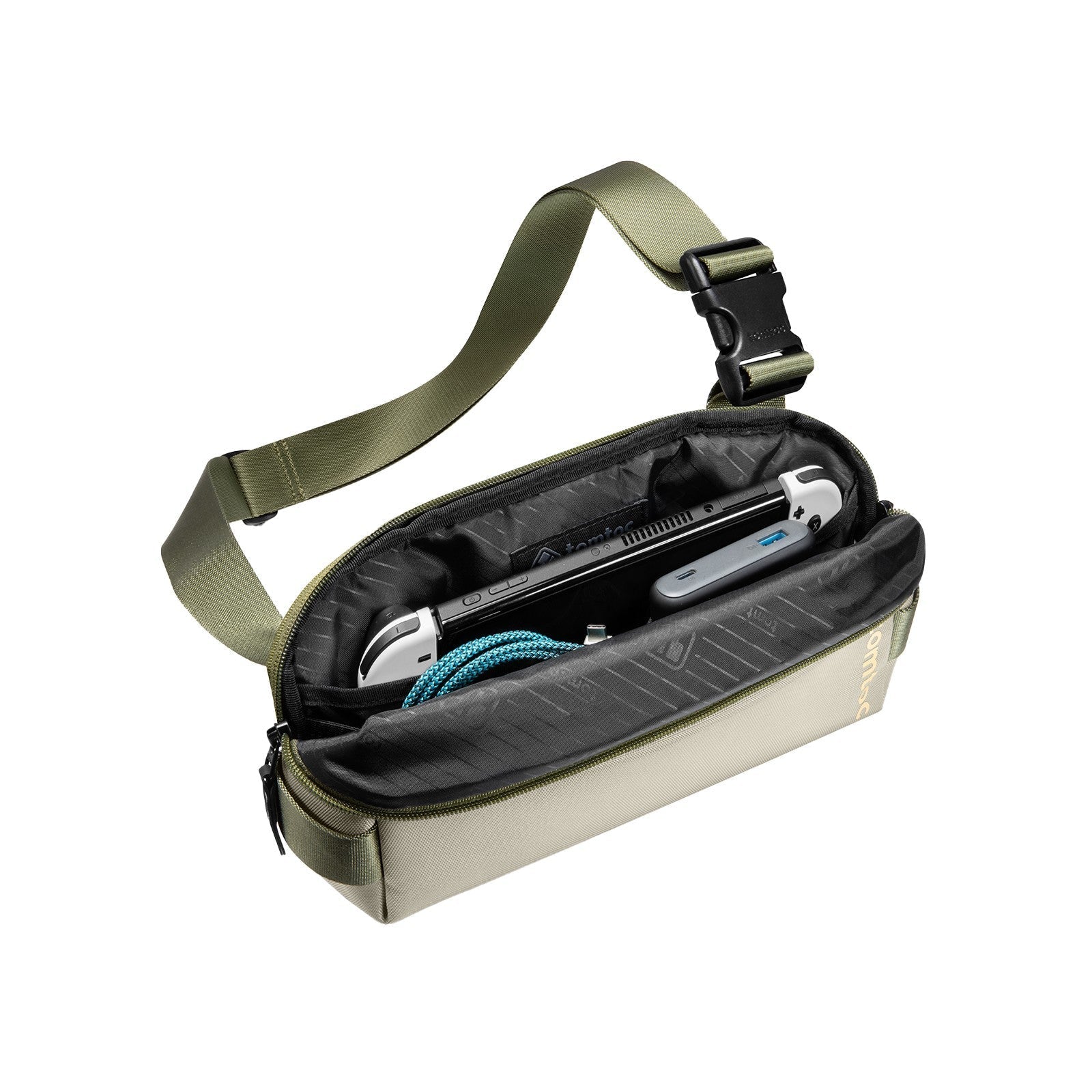 Features three compartments. Quick access front pocket for AirPods Pro, credit cards; Multiple internal pockets in the middle for tech devices, such as Kindle, Nintendo Switch console, Power Bank, cable etc. ; Hidden back pocket for your mobile phone or passport.