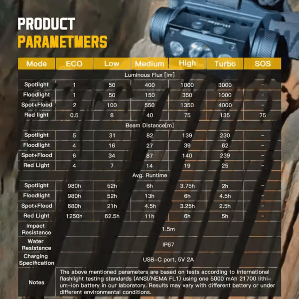 - Turbo (Spotlight + Floodlight): 4000 lumens for approximately 1 minute (steps down after initial output)